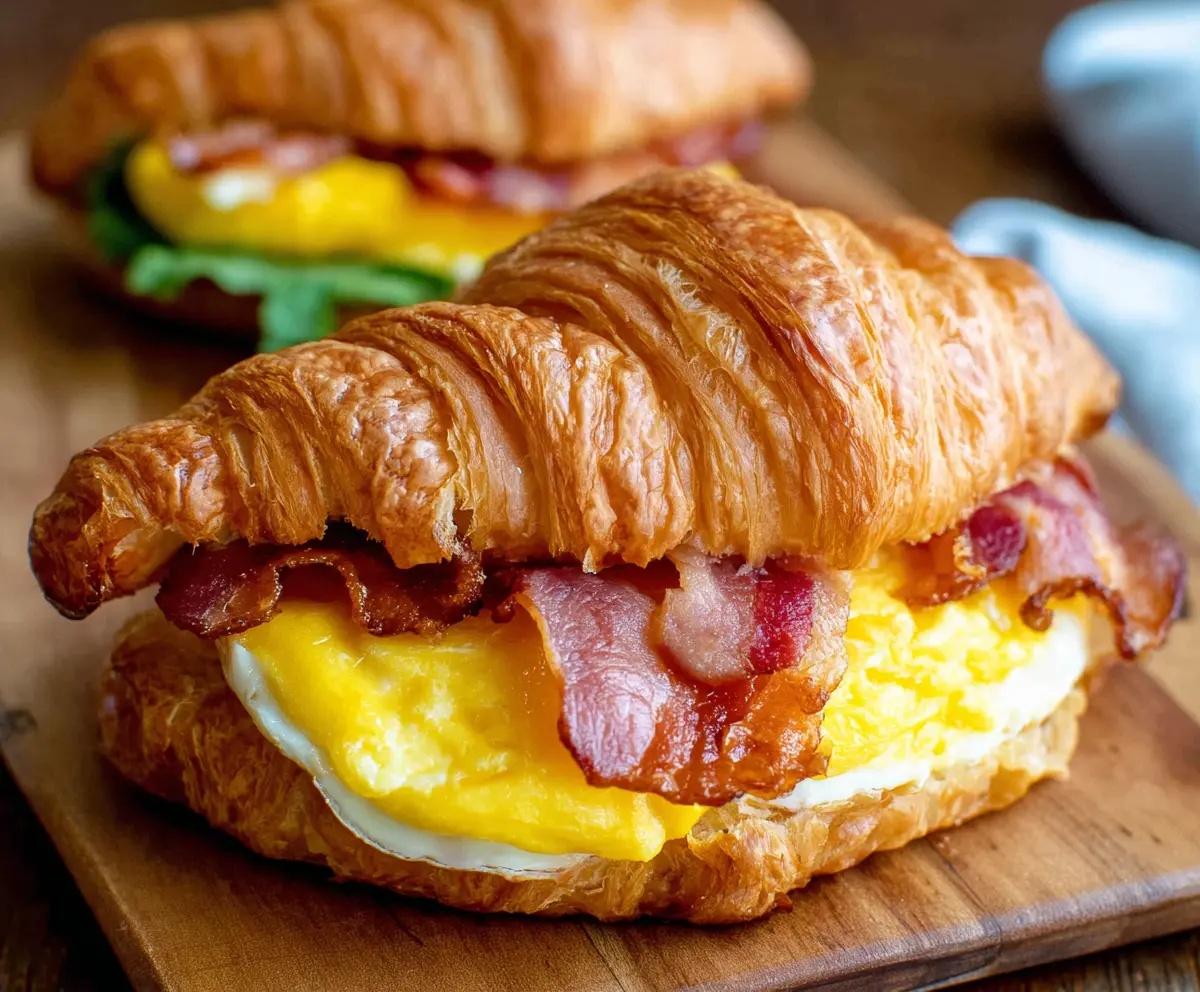 Enjoy your warm, flaky croissant sandwich filled with savory bacon and eggs! It’s a classic breakfast that’s sure to start your day off right!