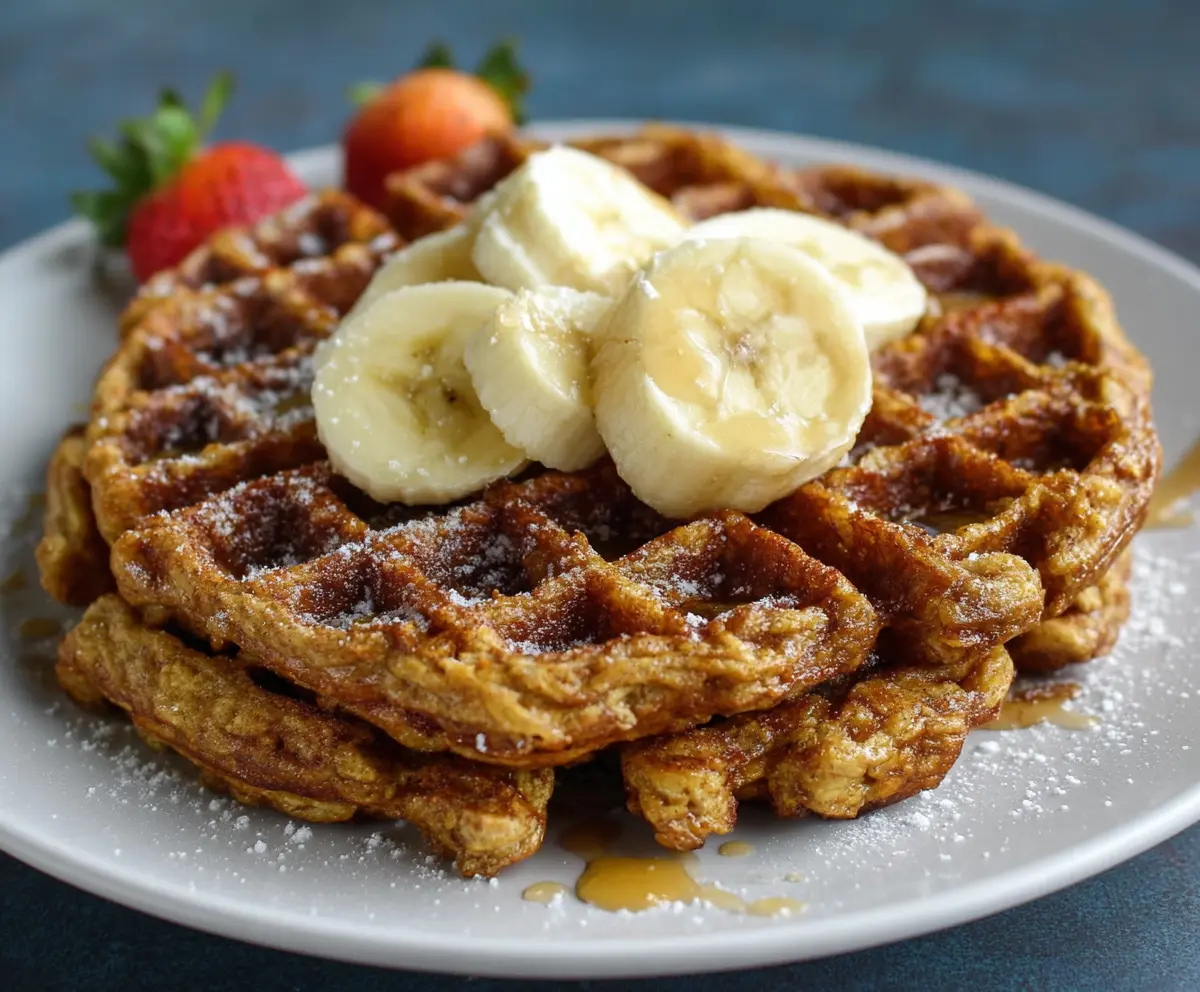 Carefully remove the waffles and place them on a plate. Top them with your choice of fresh banana slices, a drizzle of maple syrup, strawberries, and a light dusting of powdered sugar for some extra sweetness.