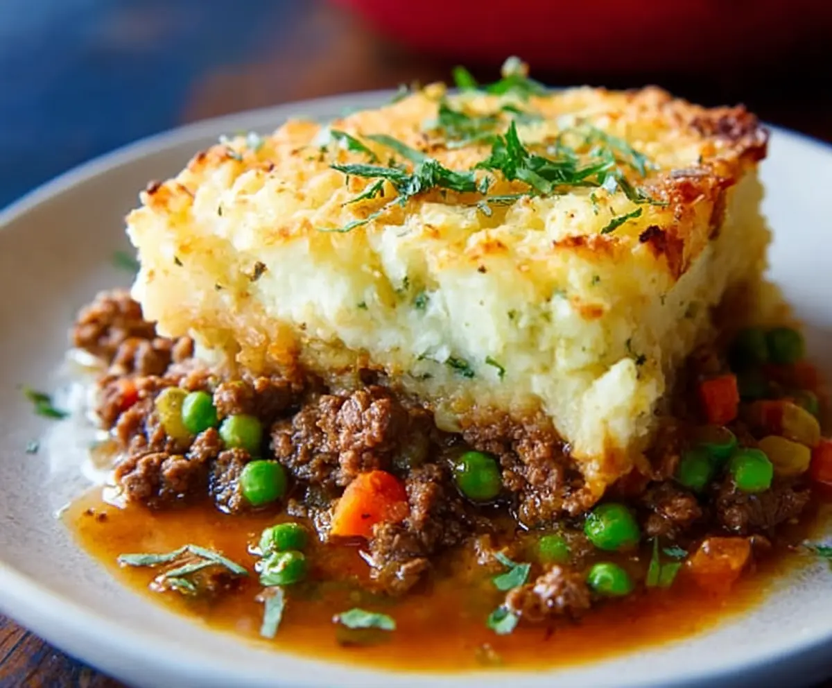 Beef Shepherd’s Pie is a cozy dish with a hearty beef filling topped with creamy mashed potatoes. It’s like a warm hug on a plate!