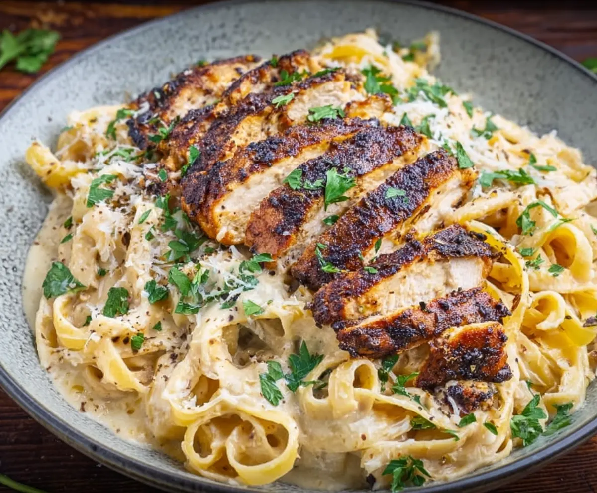 This Blackened Chicken Pasta Alfredo is a tasty dish that combines creamy sauce with tender chicken and pasta. The chicken gets a special spicy coating that adds a burst of flavor!