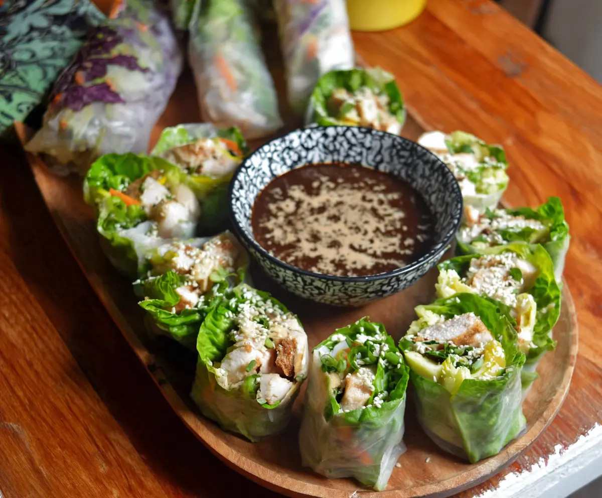 This recipe takes about 20 minutes to prepare, including making the dressing, chopping the veggies, and assembling the rolls. It’s a quick and healthy option for a meal or snack!