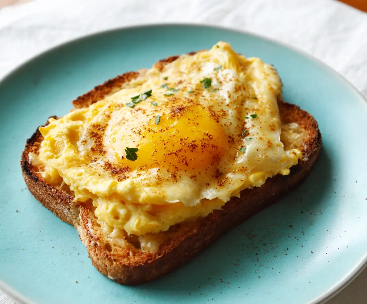 Carefully slide the cheesy egg off the skillet and place it on top of your toasted bread. Season with salt and freshly ground black pepper to taste. If you have fresh chives or parsley, sprinkle some on top for a pop of color and flavor.