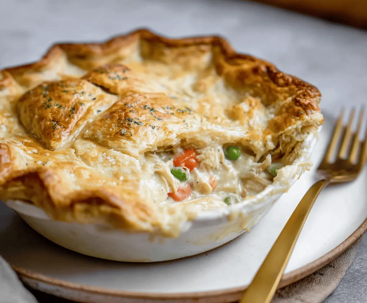 Golden-brown chicken pot pie topped with flaky crust and steaming filling of tender chicken, vegetables, and creamy sauce.