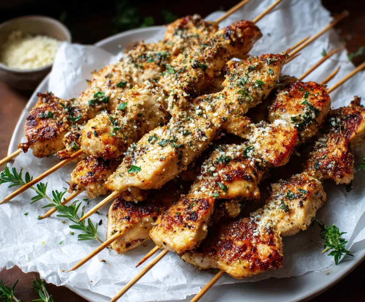 These chicken skewers are loaded with flavor! Marinated in garlic and sprinkled with parmesan, they’re tender and tasty, perfect for a quick meal or a fun BBQ!