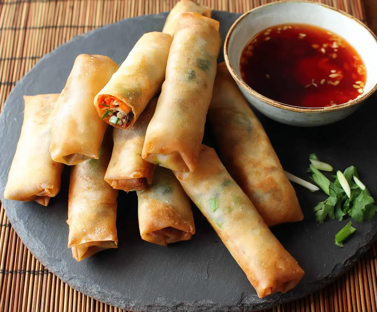 Your crispy, flavorful Chinese spring rolls are now ready to enjoy! Serve them hot with sweet chili sauce or any of your favorite dipping sauces. Happy eating!