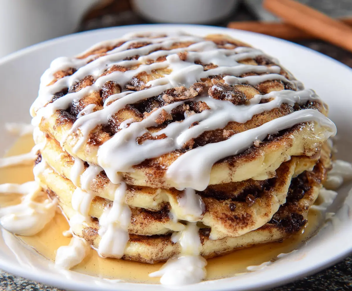 These Cinnamon Roll Pancakes are a delicious twist on a classic breakfast favorite, combining the fluffy texture of pancakes with the sweet flavors of cinnamon rolls topped with creamy glaze. Enjoy!