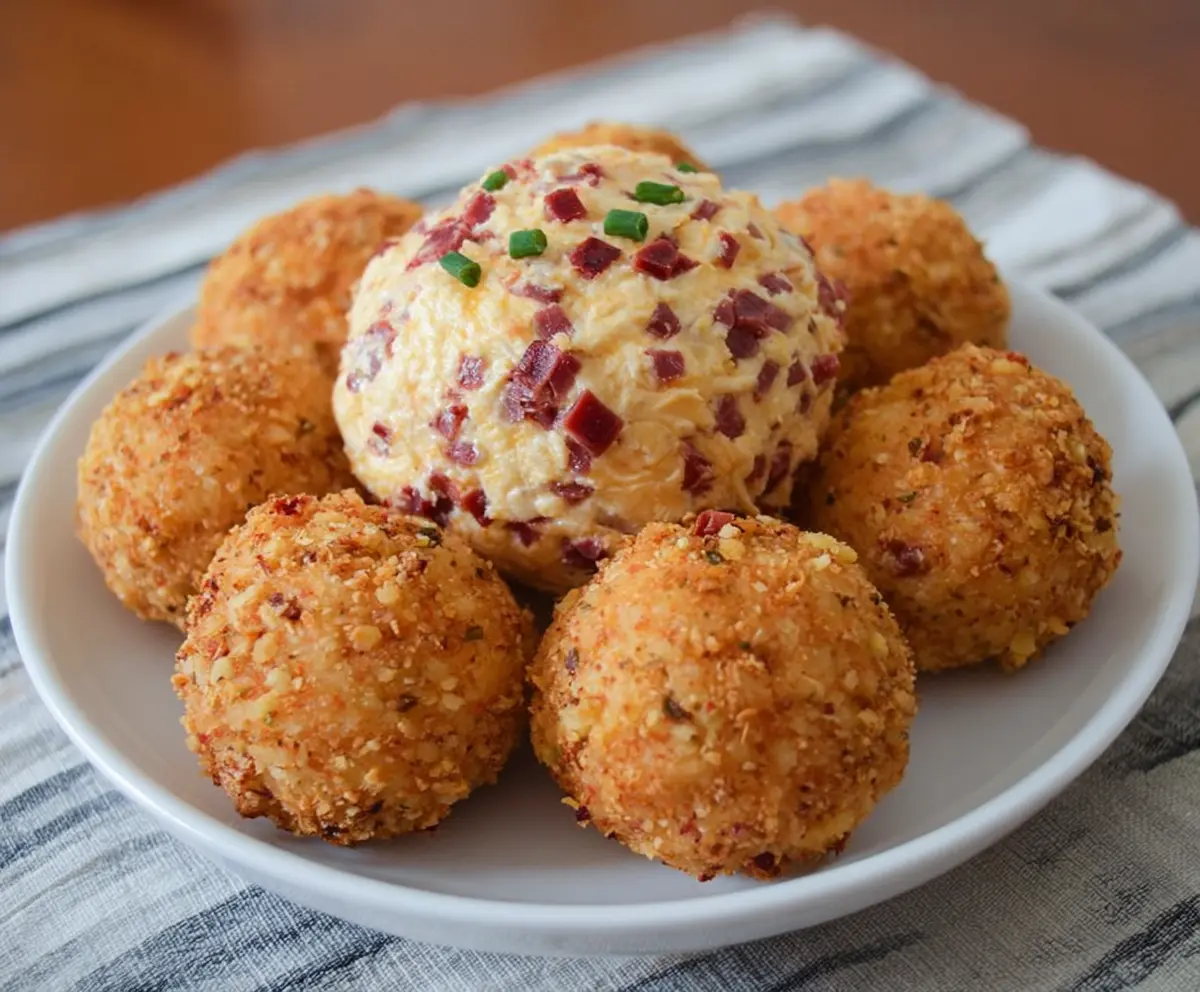 Grab a serving plate and place the large cheese ball in the center. Arrange the fried cheese balls around it, and sprinkle some extra chopped green onions or chives on top for a fresh look. How inviting!