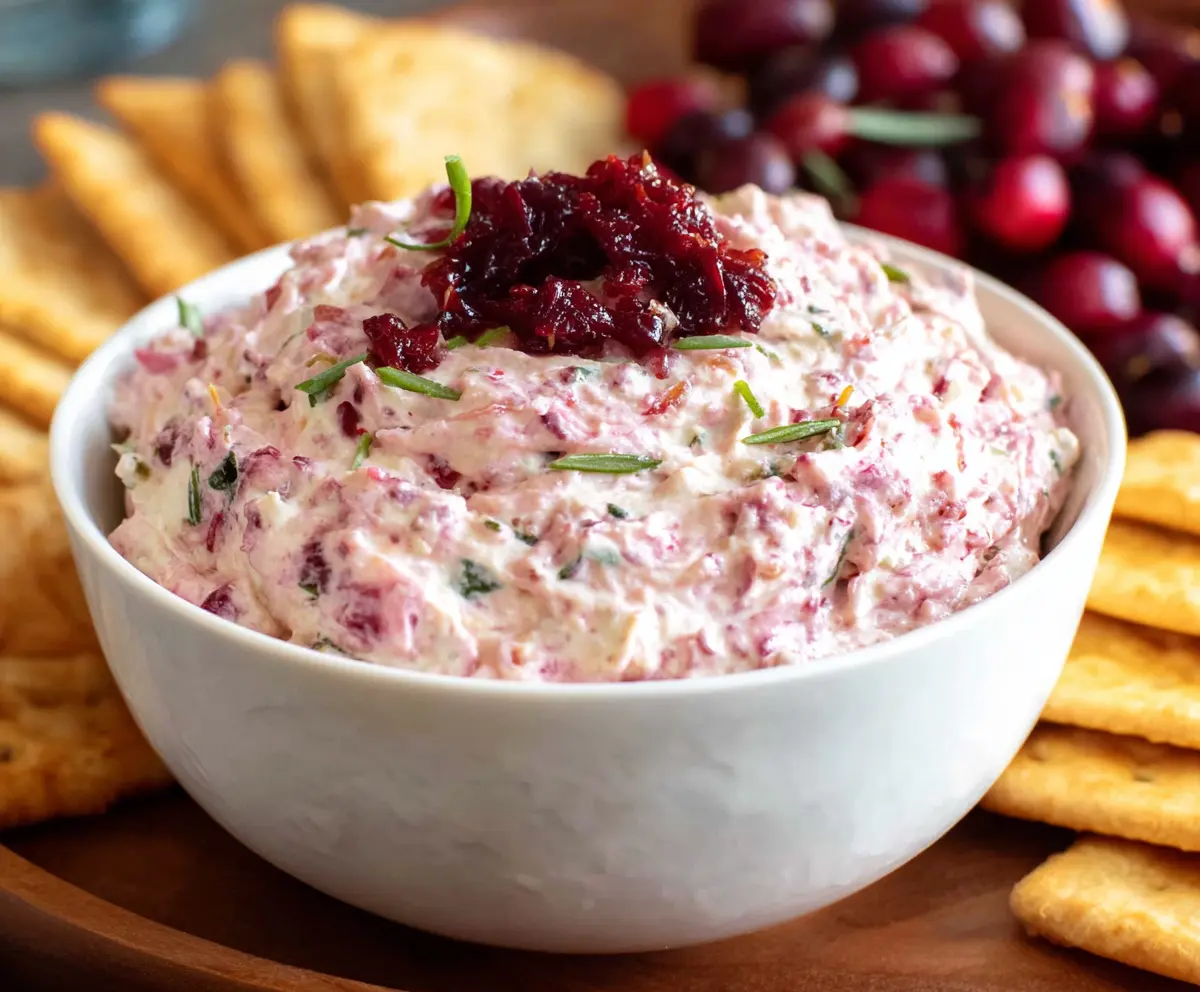 Once everything is well mixed, transfer your delicious dip into a serving bowl. For a festive touch, garnish with a few whole cranberries and some chopped fresh chives on top.