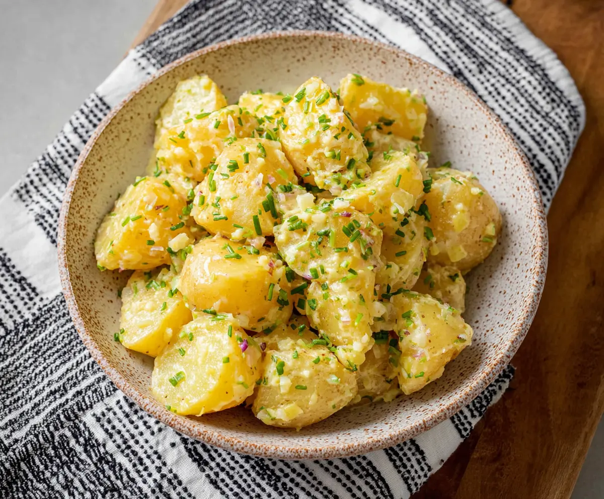 Transfer the coated potatoes to a serving bowl. Sprinkle the remaining fresh chives on top for a lovely garnish. You can serve them warm or let them cool to room temperature—either way, they are a flavorful side dish!