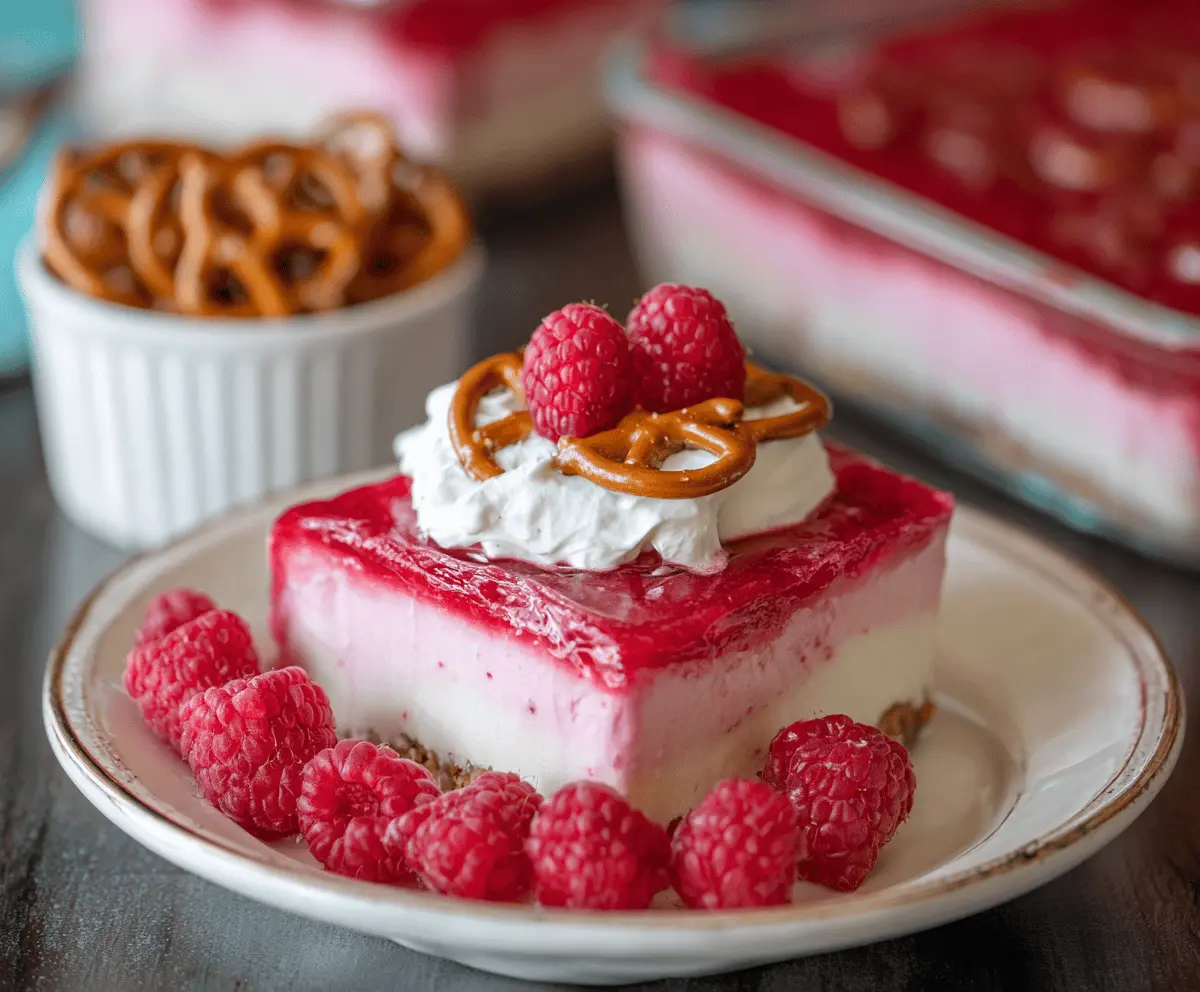 This delicious dessert features a perfect balance of a salty-sweet pretzel crust, a rich and fluffy cream cheese layer, and a vibrant raspberry topping that’s sure to impress your friends and family. Enjoy! 🍰