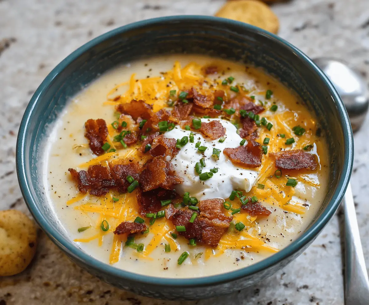 Dish the soup into bowls and top with extra shredded cheddar cheese, bacon crumbles, and chopped green onions. Optionally, serve with crackers on the side for a delightful crunch!