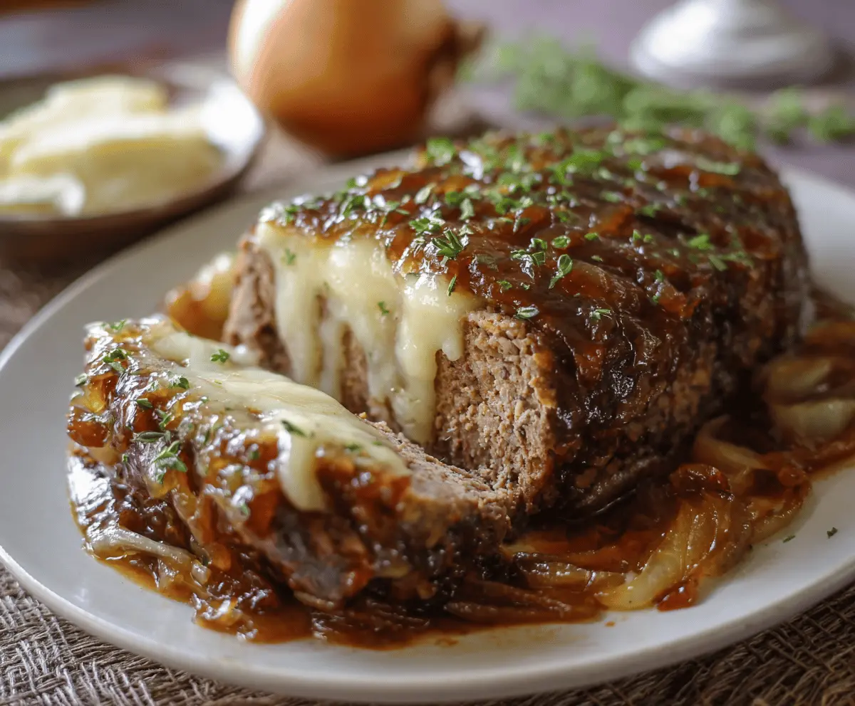 This hearty French Onion Meatloaf is comfort food at its peak, filled with tender caramelized onions and gooey melted Swiss cheese. Enjoy!