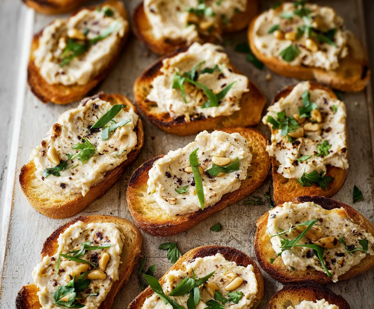 This simple crostini features a creamy white bean spread with bright lemon and garlic notes, making it an ideal choice for entertaining or a light snack anytime!