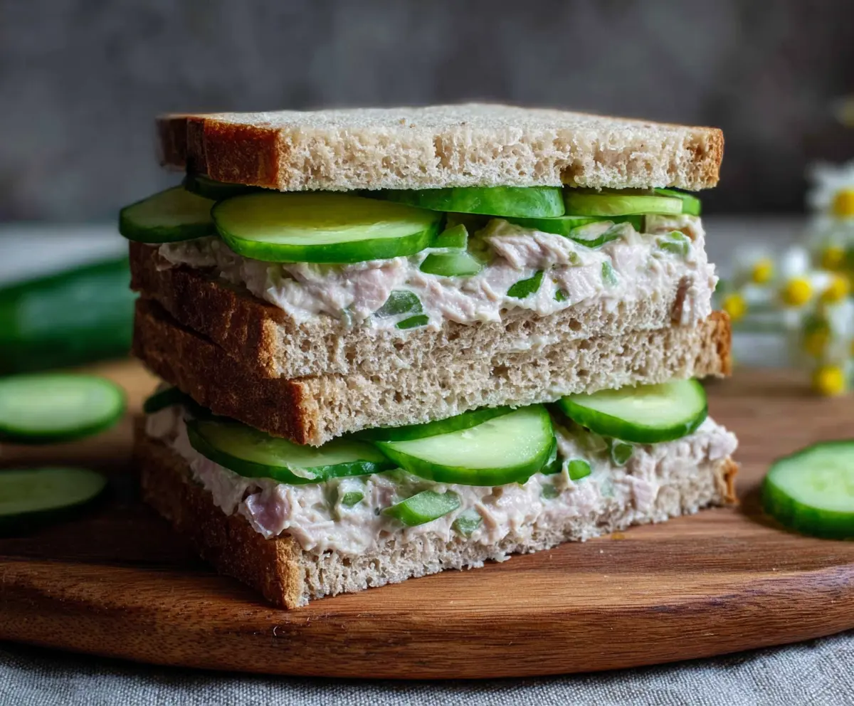 Layer the thin cucumber slices on top of the tuna mixture on each sandwich. You can also sprinkle some fresh parsley or dill if you’re using them for an extra burst of flavor!