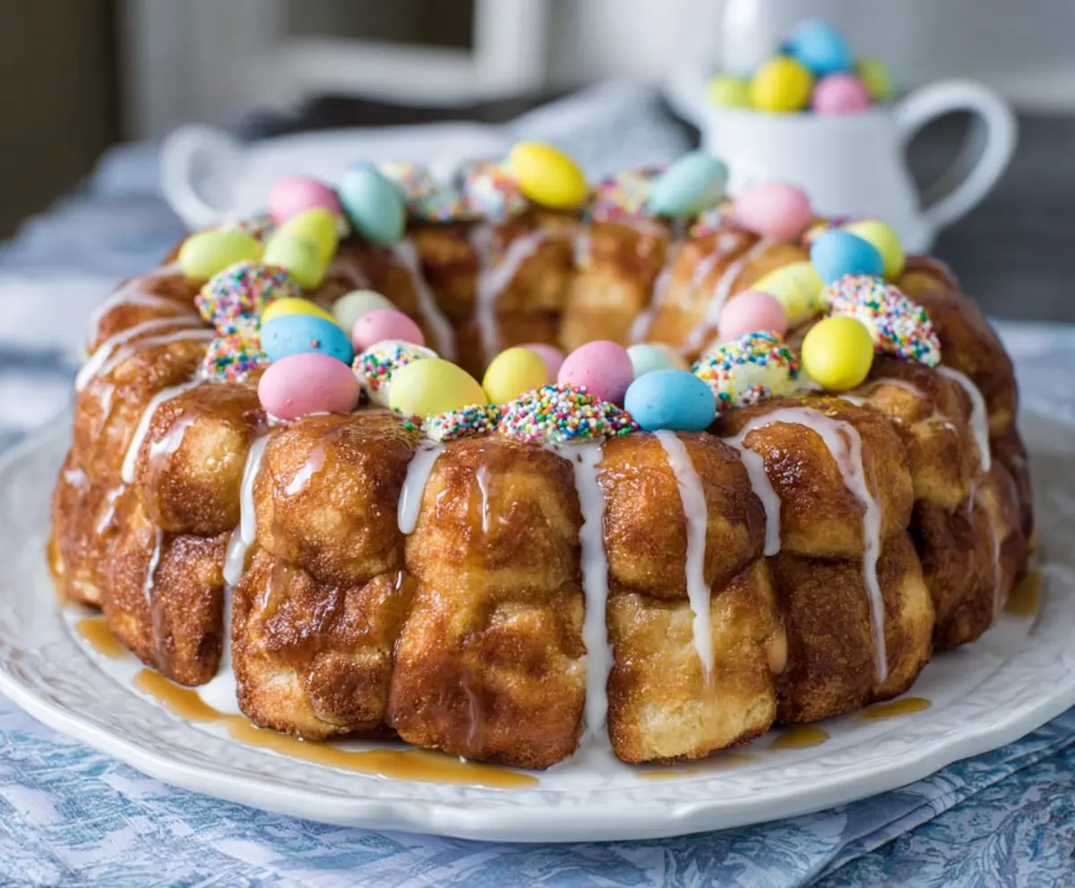 Drizzle the glaze over the monkey bread you’ve just inverted. Then, have fun decorating the top with your assorted pastel-colored candy-coated chocolate eggs, arranging them in a wreath or scattered pattern for a festive look!