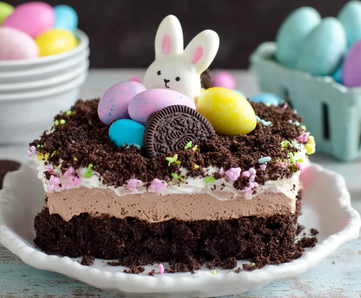 This playful Easter Dirt Cake looks like a fun garden! It’s made with rich chocolate pudding, creamy whipped topping, and crunchy cookie crumbs. Topped with colorful candy eggs, it’s a real treat!