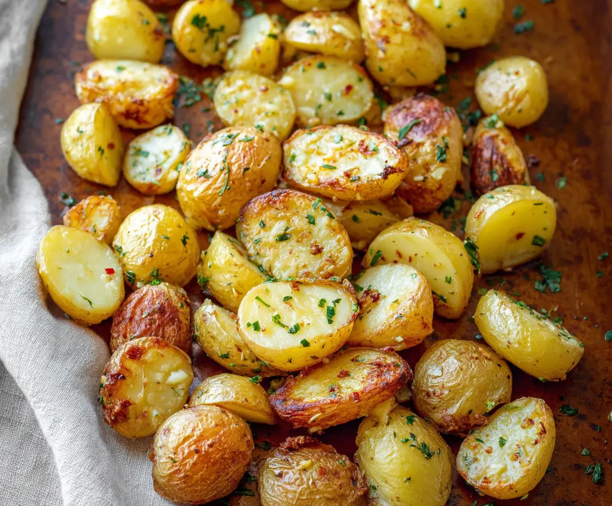 Once the potatoes are tender inside and crispy on the outside, take them out of the oven. Transfer them to a serving plate. If you want to add a little extra color and flavor, sprinkle some fresh chopped parsley on top.