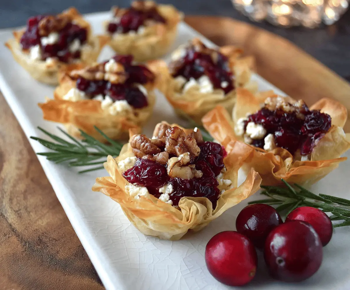 These Goat Cheese Cranberry Phyllo Cups are a delicious mix of creamy goat cheese and sweet cranberry sauce, all wrapped in crispy phyllo pastry. They are perfect for parties!