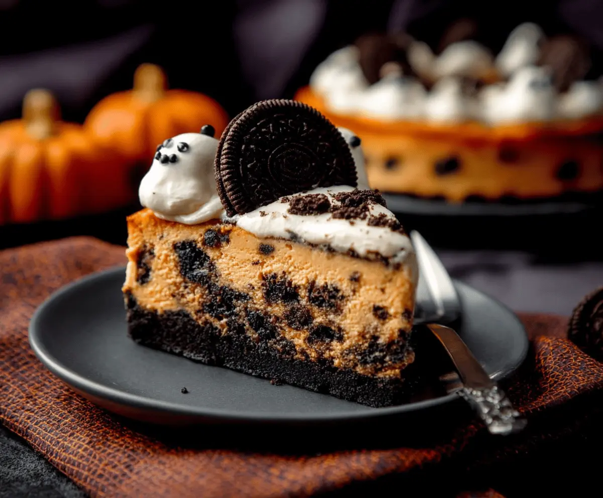 Who can resist a dessert that combines cheesecake and cookies? I love serving it topped with whipped cream to make it extra festive. Get ready for some tasty bites! 🎃