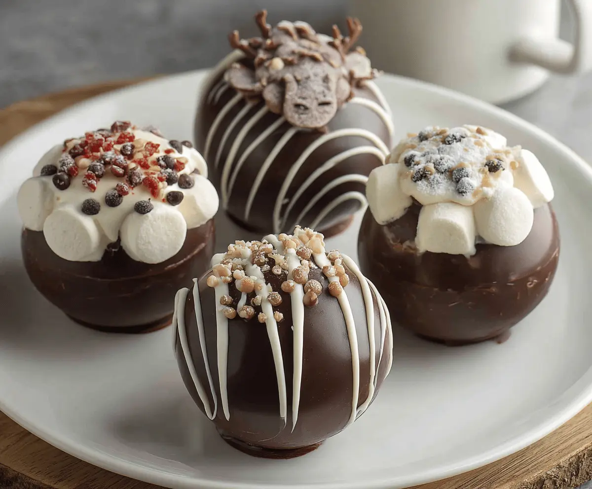 Now it’s time to get creative! Drizzle some white chocolate over the bombs using a spoon or a piping bag for a fancy finish. Add a few mini marshmallows on top, dust with cocoa powder or powdered sugar, and sprinkle on some edible decorations if you like!