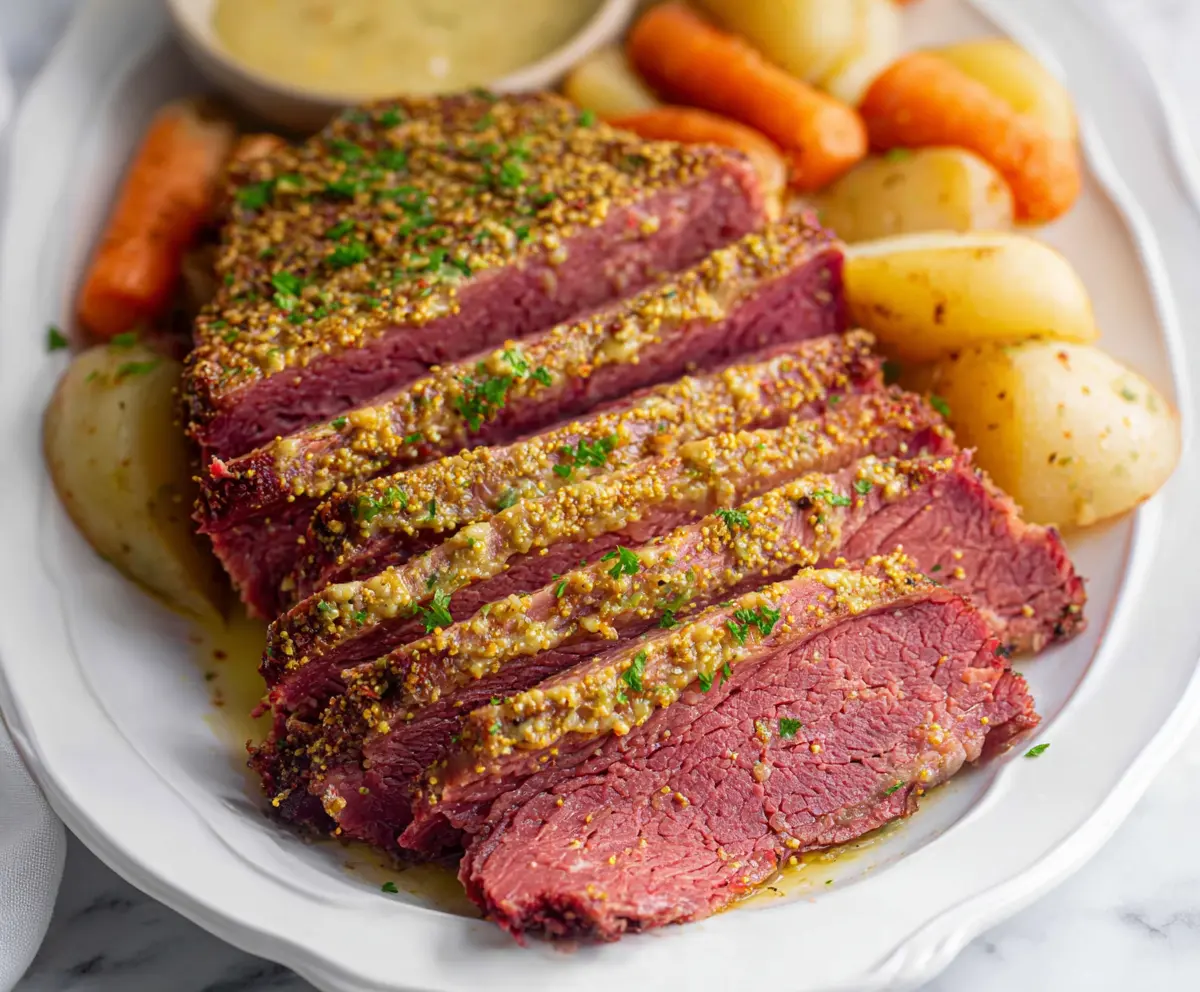 Absolutely! Simply follow the same steps but place everything in the slow cooker. Cook on low for 8-10 hours or on high for 4-5 hours until the corned beef is tender. You can still finish it off under the broiler for the mustard glaze!