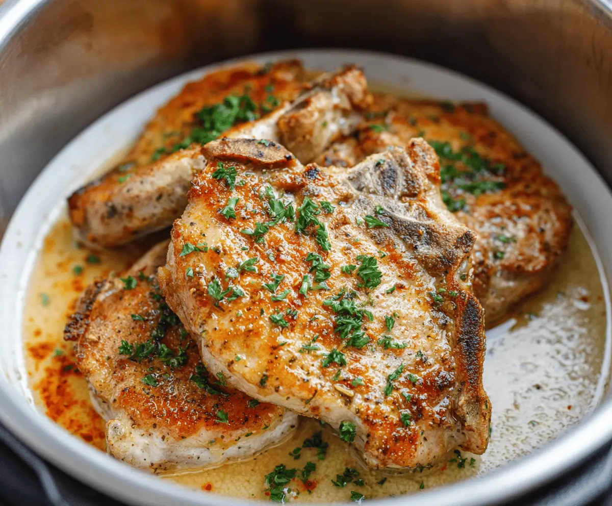 Enjoy your tender, juicy Instant Pot pork chops with the savory herb-infused sauce!