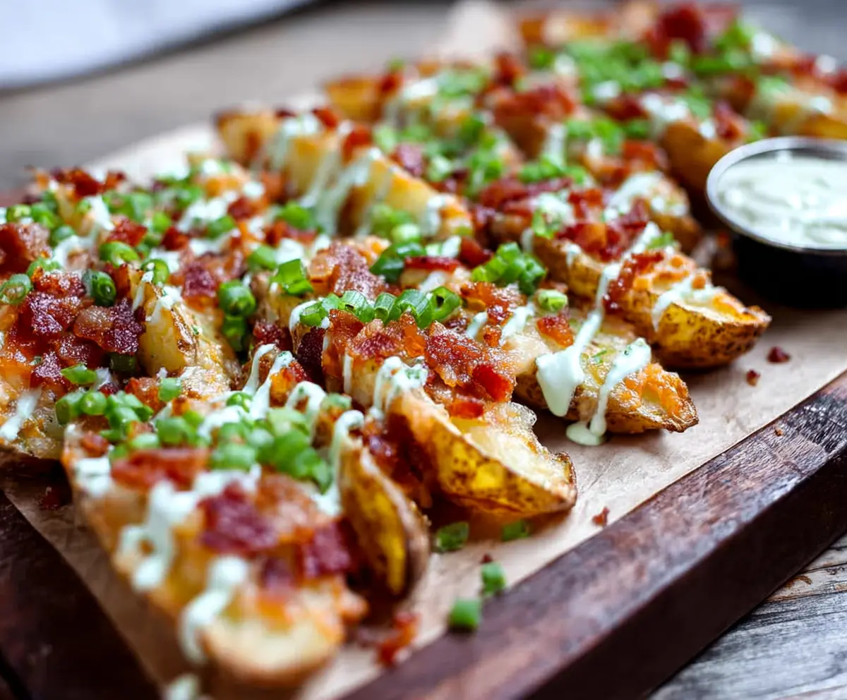 These loaded baked potato wedges are crispy on the outside and fluffy on the inside, topped with cheese, bacon, and green onions. Perfect for sharing or devouring solo!