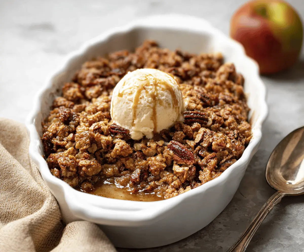 Let it cool slightly after baking to set up. Enjoy this delightful crisp with vanilla ice cream, which melts into the warm topping for a treat that’s hard to resist!