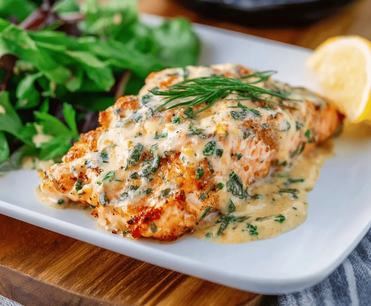 This creamy herb salmon is a true showstopper! It features tender salmon fillets smothered in a rich garlic butter sauce, making every bite feel like a special occasion.