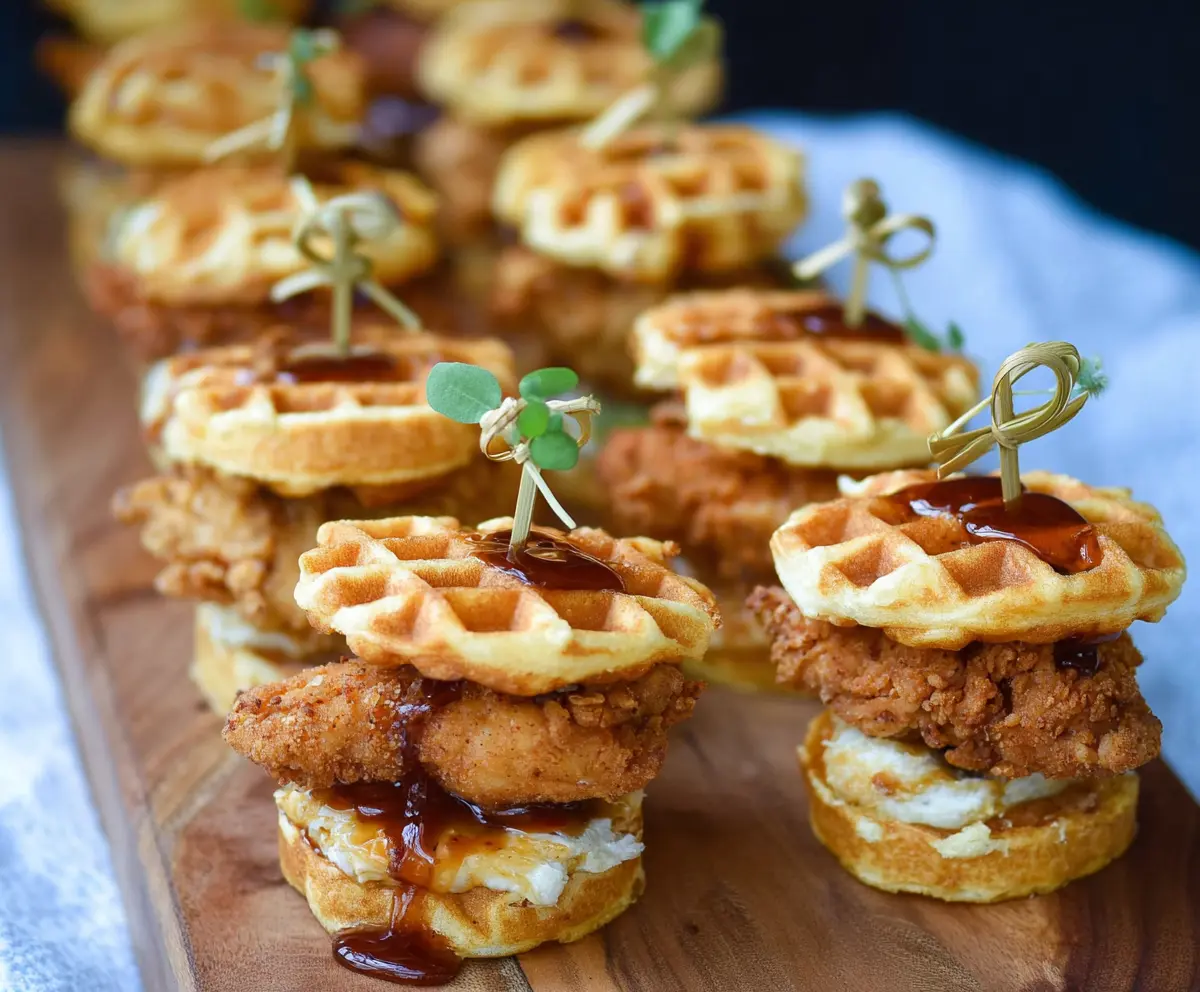 These Mini Chicken and Waffle Sliders are the perfect bite-sized treat! Crispy chicken between fluffy waffles creates a tasty combo. Add some maple syrup for that sweet finish!
