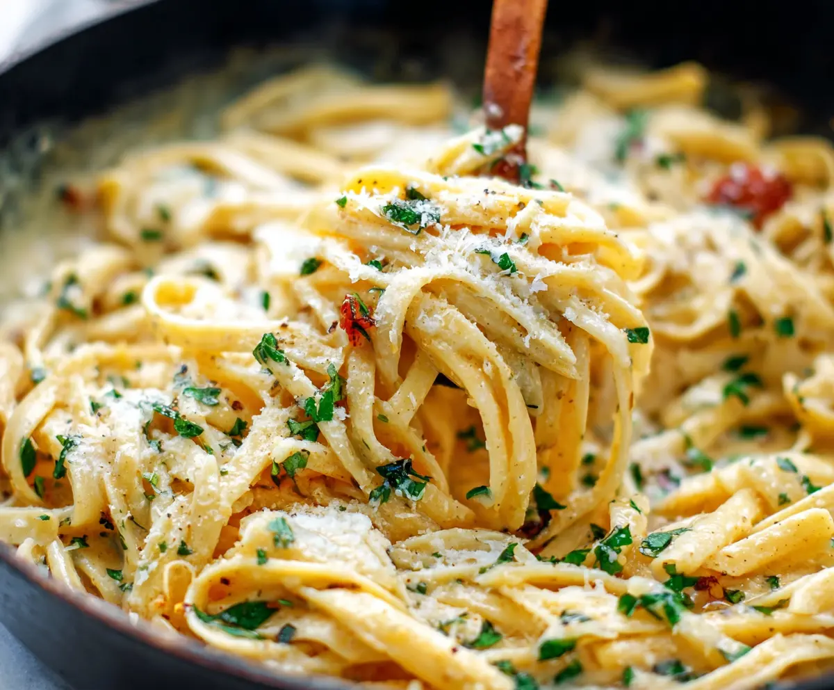 Remove the skillet from heat. Sprinkle the chopped fresh parsley and some extra Parmesan on top for a finishing touch. Serve immediately while the pasta is hot and creamy—enjoy every bite!