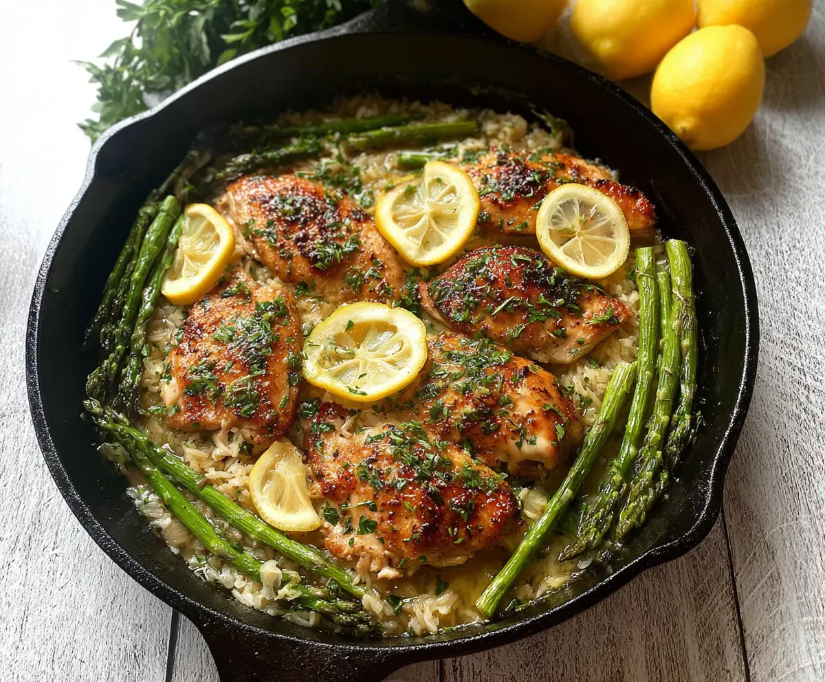Once done, take it out of the oven and garnish with freshly chopped parsley. Serve hot and enjoy your flavorful lemon herb chicken alongside tender asparagus and perfectly seasoned rice!