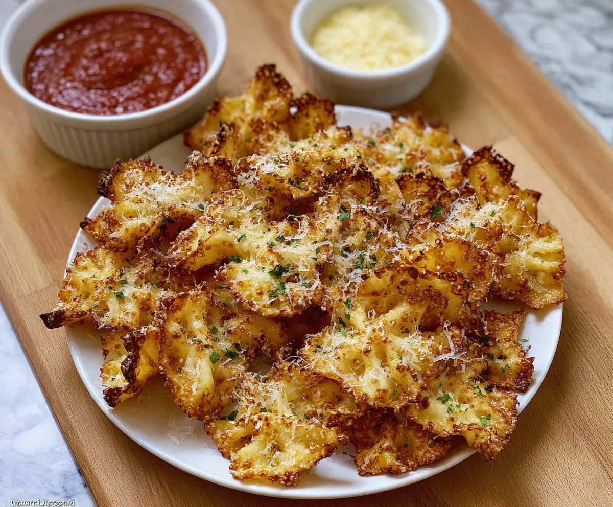 After baking, carefully take the baking sheet out of the oven. Let the pasta chips cool for a couple of minutes—this will help them crisp up even more. Once cooled, sprinkle with a little extra Parmesan cheese and fresh chopped parsley for a lovely touch.