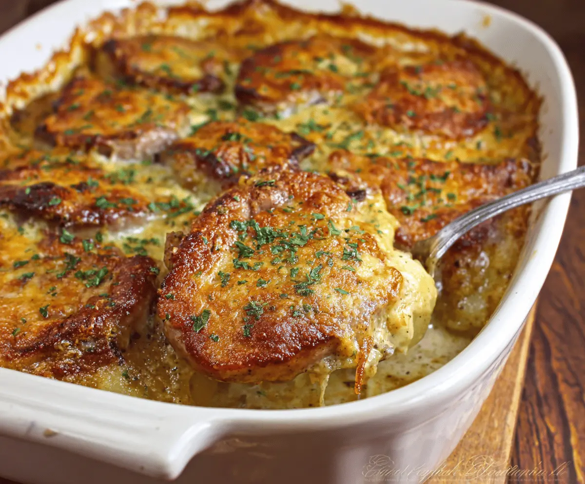Cover the casserole dish with foil and place it in your preheated oven. Bake for 1 hour. After that, remove the foil and bake an additional 20-30 minutes. You want the top to be golden brown, the potatoes to be tender, and the pork chops to reach an internal temperature of 145°F (63°C).