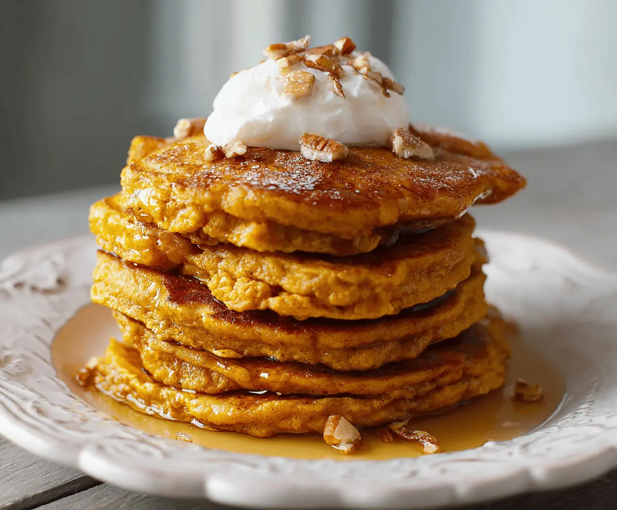 Repeat cooking with the remaining batter, adding more butter to the skillet as needed. Serve the pancakes warm, stacked high on a plate, drizzled with maple syrup, and topped with a dollop of whipped cream and a sprinkle of cinnamon or pumpkin pie spice if desired.
