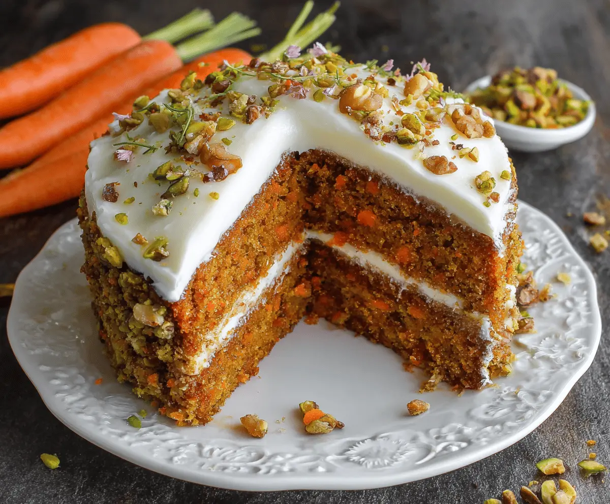 Enjoy every moist, spiced, and scrumptious bite of this Pumpkin Carrot Cake topped with creamy cream cheese frosting and crunchy toppings! 🍰