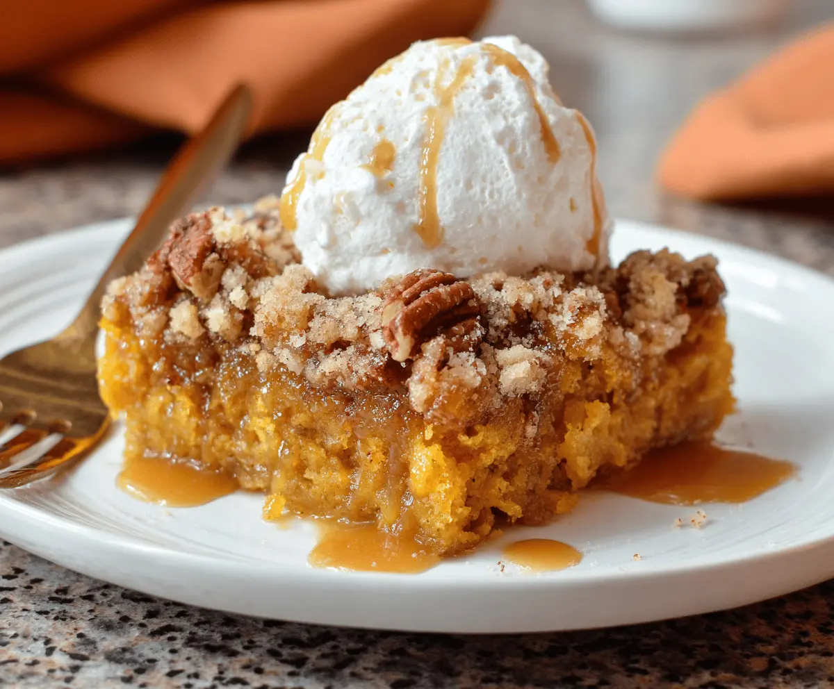 Serve each slice topped with a generous dollop of whipped cream and a drizzle of caramel sauce for extra flavor if you’d like. Enjoy your warm, comforting Pumpkin Dump Cake!