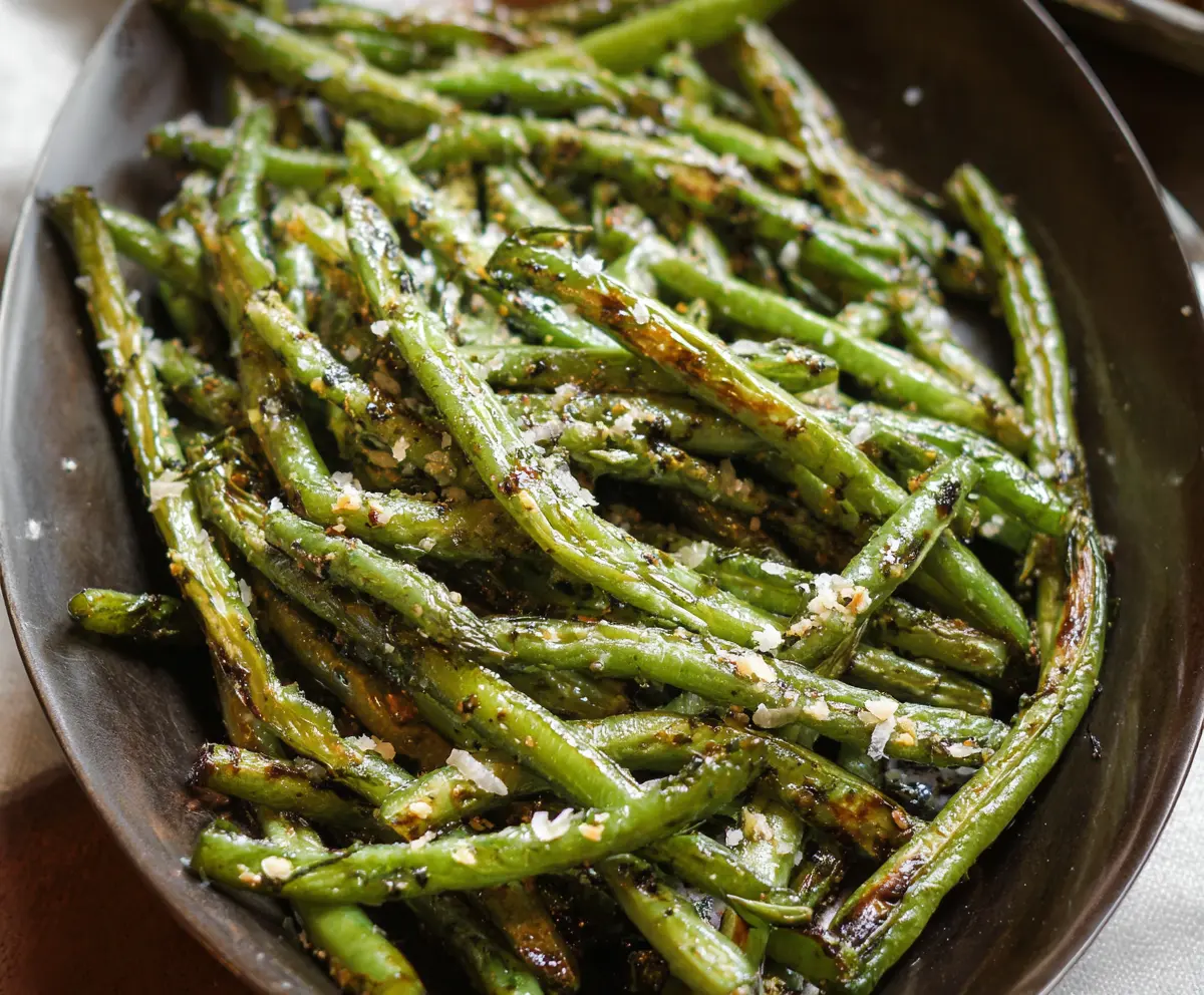 Once the green beans are tender and have some browned spots, remove them from the oven. If you’d like, sprinkle them with grated Parmesan cheese or flaky sea salt, and add a touch of chopped parsley for color and flavor.