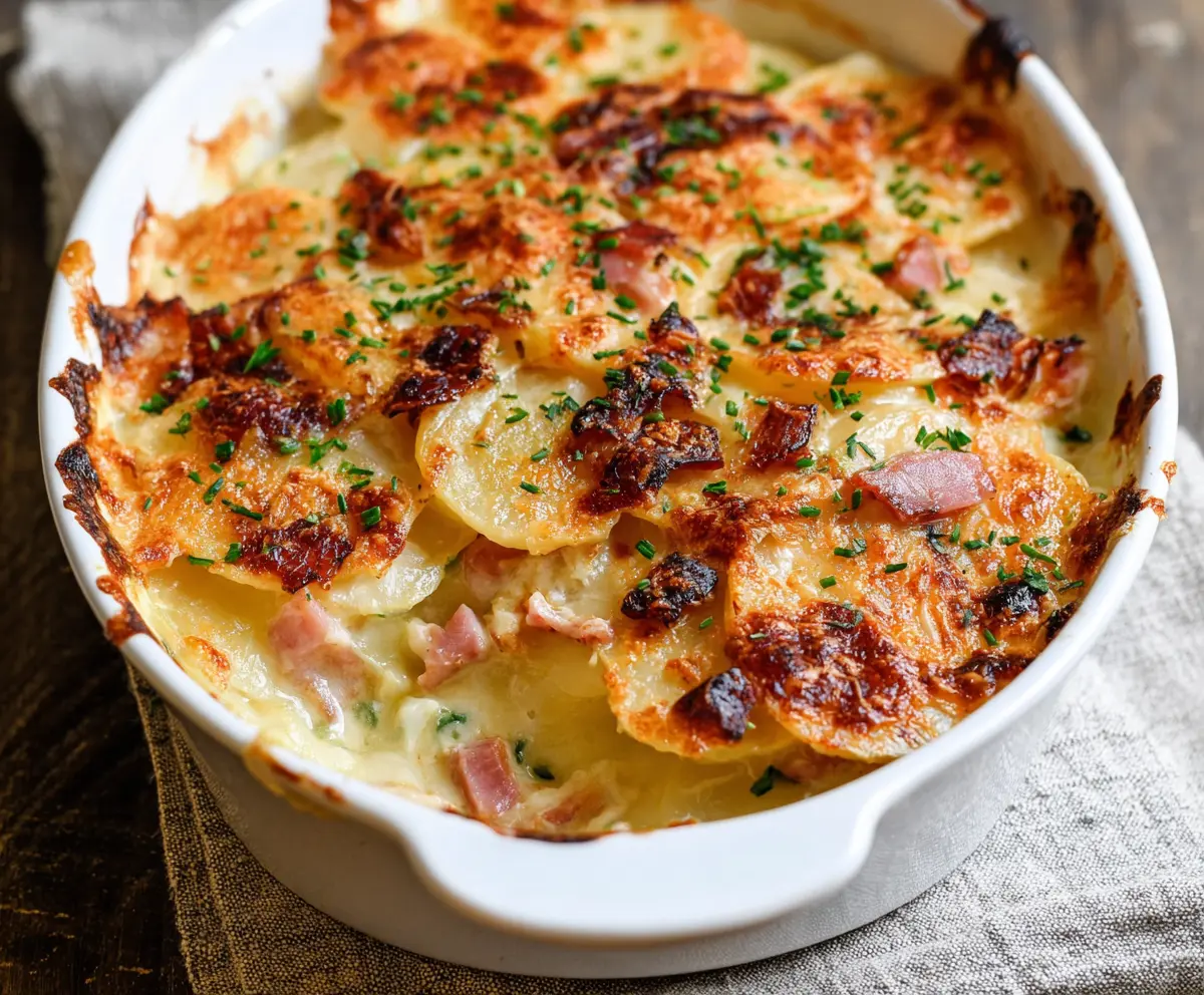Scalloped potatoes and ham is a warm, cozy dish that brings comfort to any meal. Layers of creamy potatoes and tasty ham are baked to golden perfection!