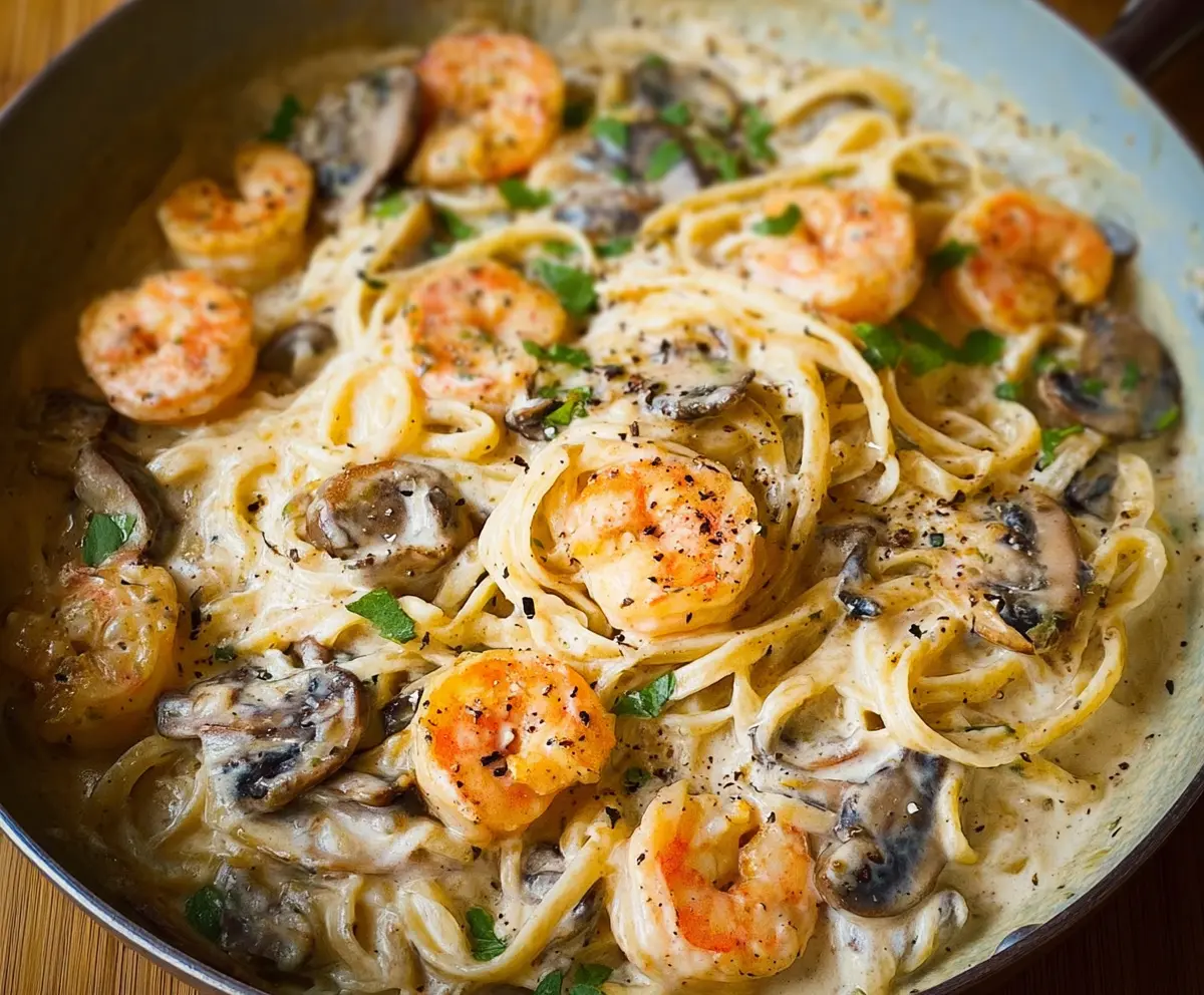 This Shrimp Alfredo Pasta is creamy and comforting, with juicy shrimp and mushrooms adding a tasty touch. The sauce is rich and smooth, making every bite feel special.