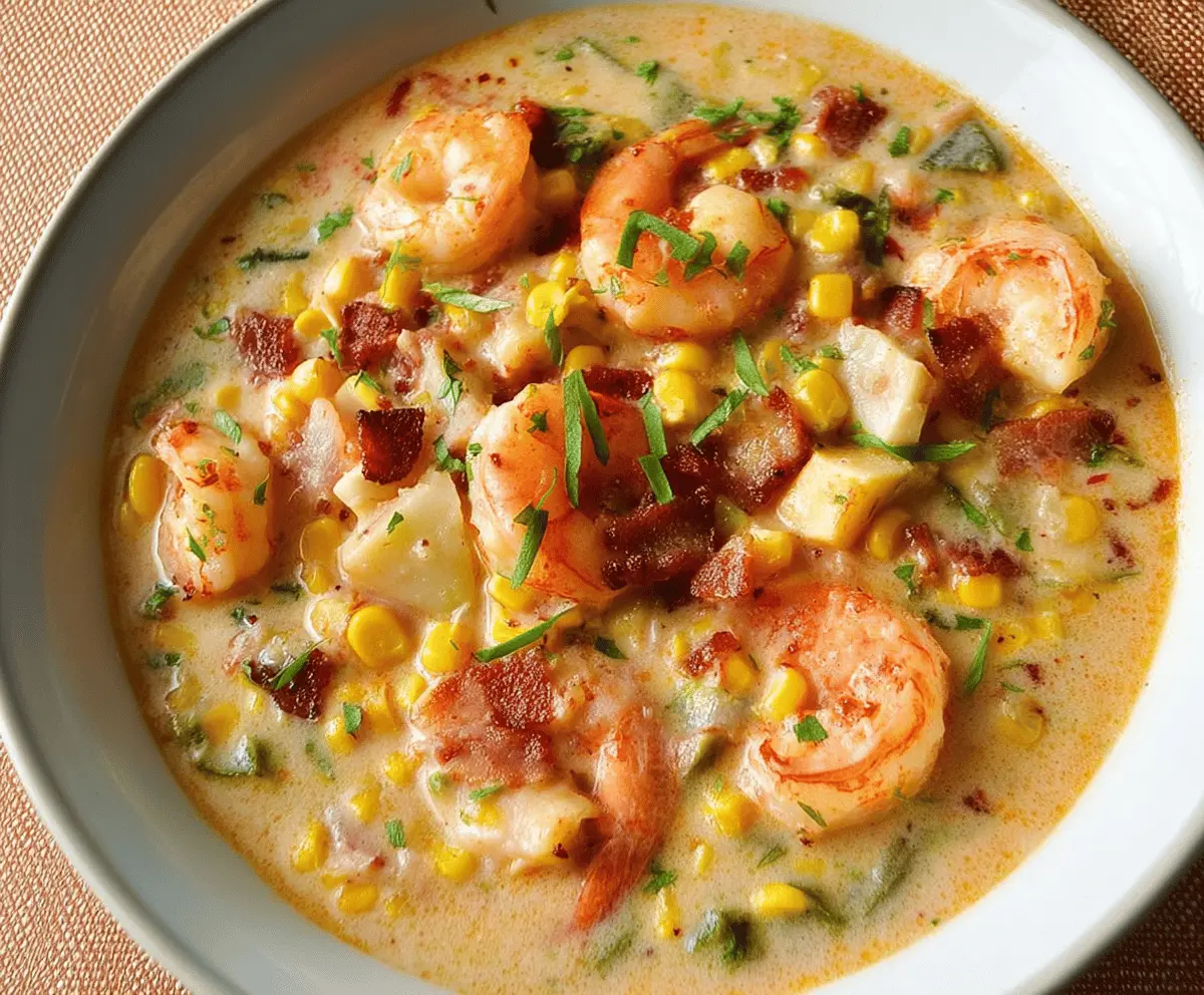 Creamy shrimp and corn chowder in a bowl, garnished with fresh herbs and served with crusty bread.