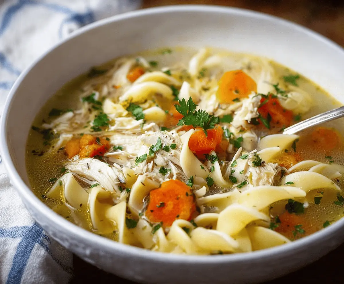 Hearty slow cooker chicken noodle soup with tender chicken, vegetables, and noodles in a flavorful broth, perfect for comfort meals.