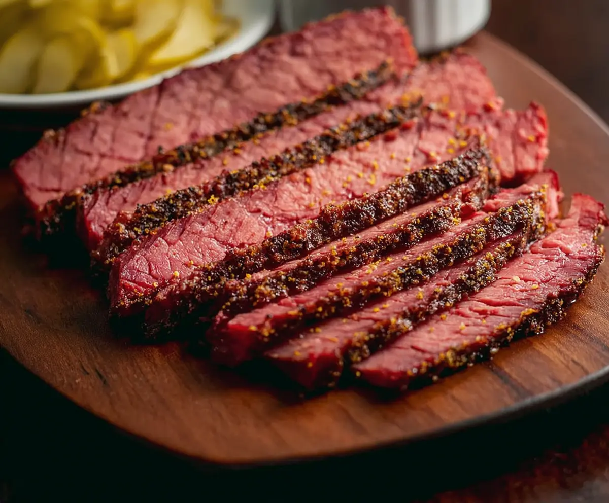 Enjoy your homemade smoked corned beef, with crispy seasoning on the outside and deliciously tender meat inside!