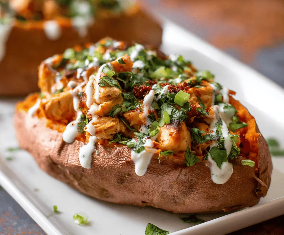 This stuffed sweet potato is a winner! It’s filled with tender chicken, delicious spices, and topped with creamy goodness. It’s like a cozy hug on a plate!