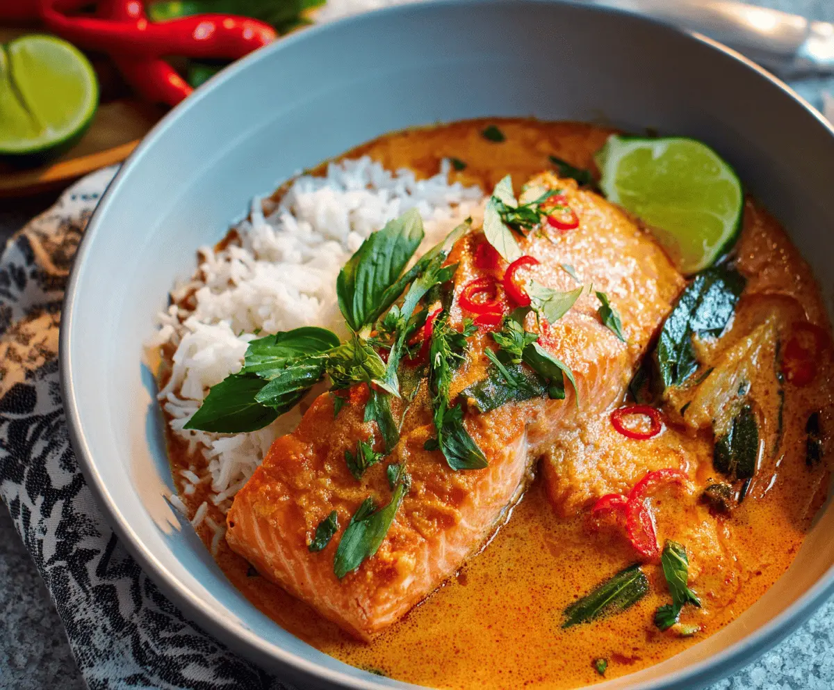 Serve the Thai Red Curry Salmon over a bed of fluffy jasmine rice. Top it with fresh Thai basil leaves, chopped cilantro, and lime slices. If you like it spicy, sprinkle on some fresh red chili or chili flakes for that extra kick!