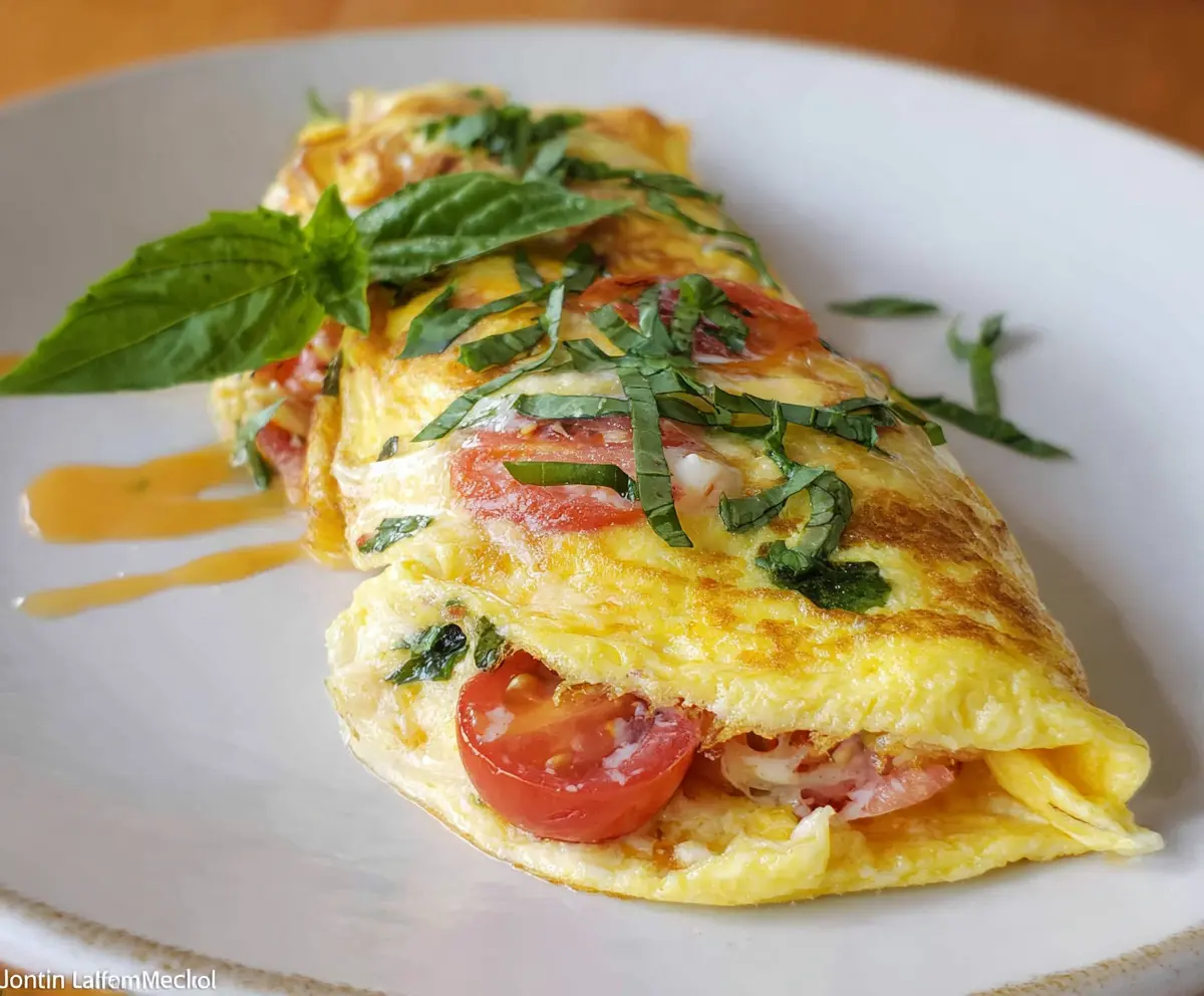 When it’s ready, gently slide the omelet onto a plate. Garnish it with the remaining fresh basil for extra color and flavor. Serve immediately, and enjoy your delicious Tomato Basil Omelet!
